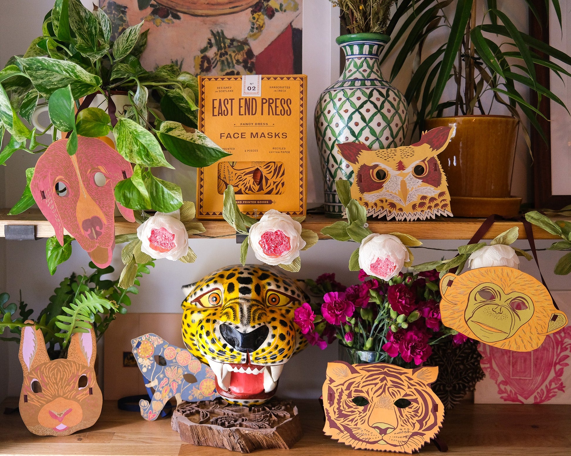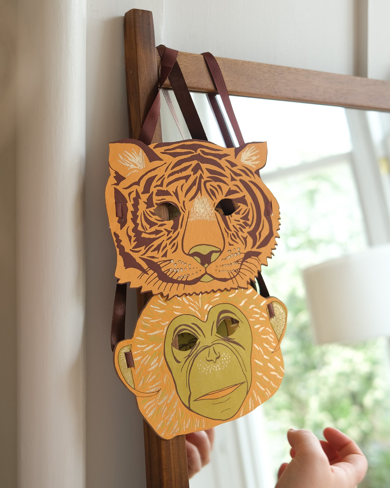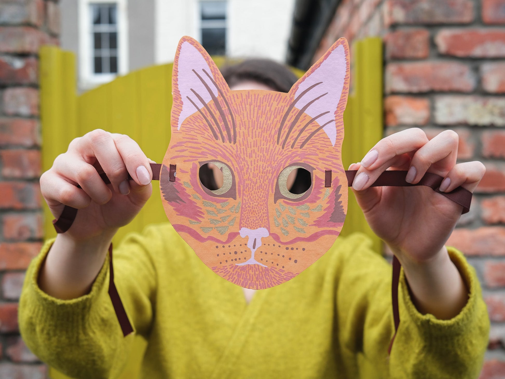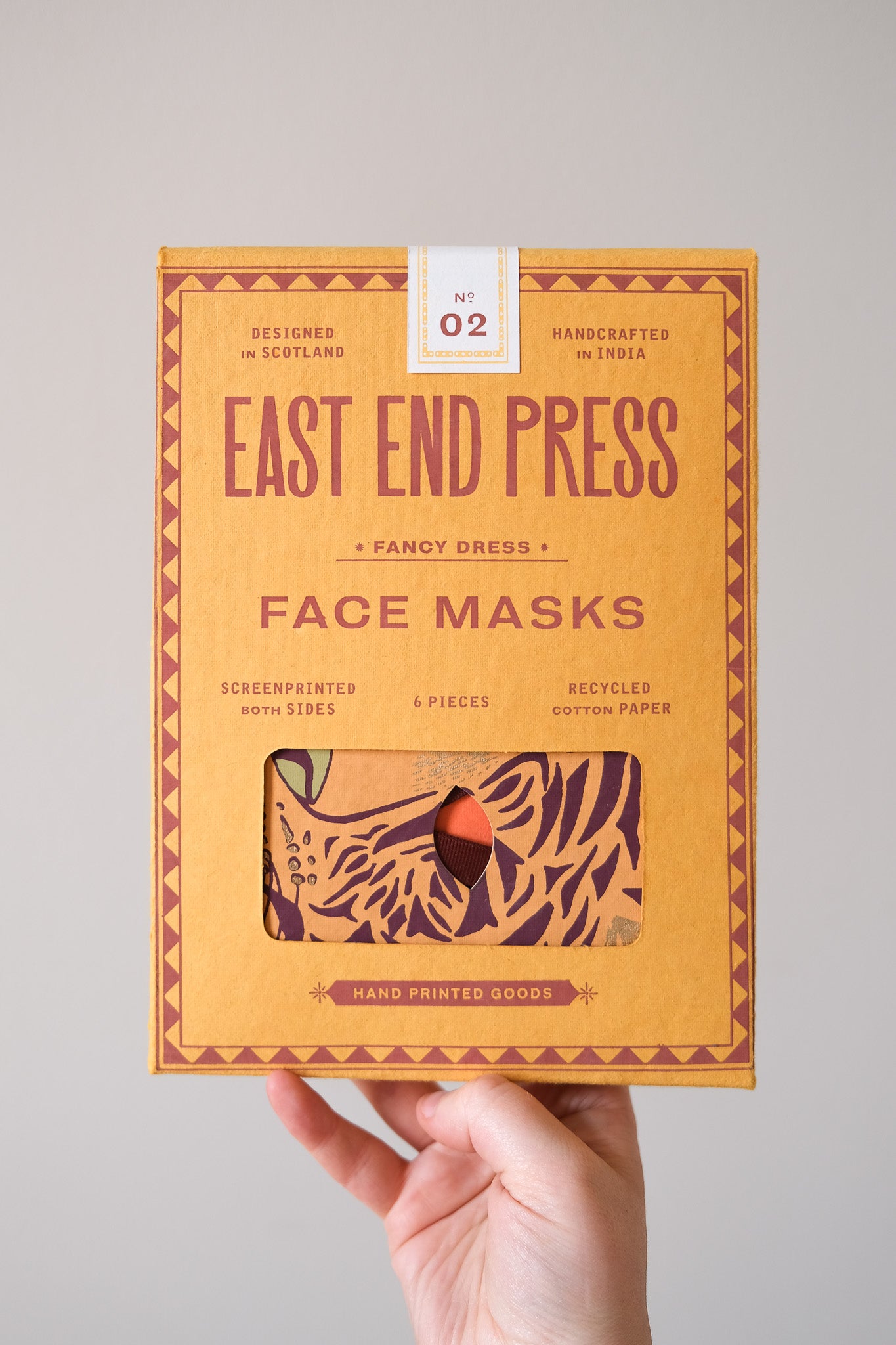 Our costume masks are screen printed on both sides on thick, handmade cotton paper. The recycled paper masks have two cut-out eye holes with securely attached ribbon on either end, making them ideal accessories for parties and fancy dress.