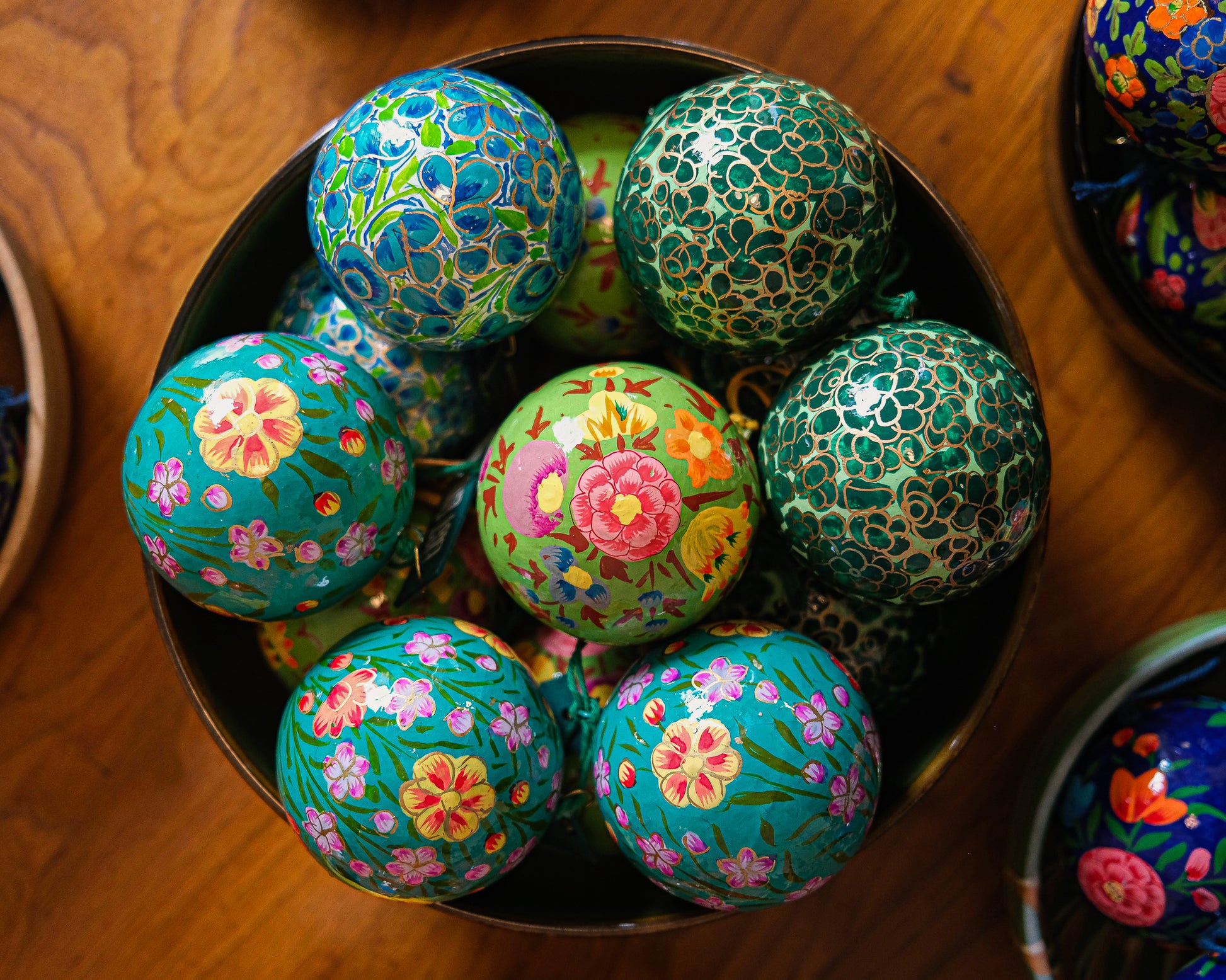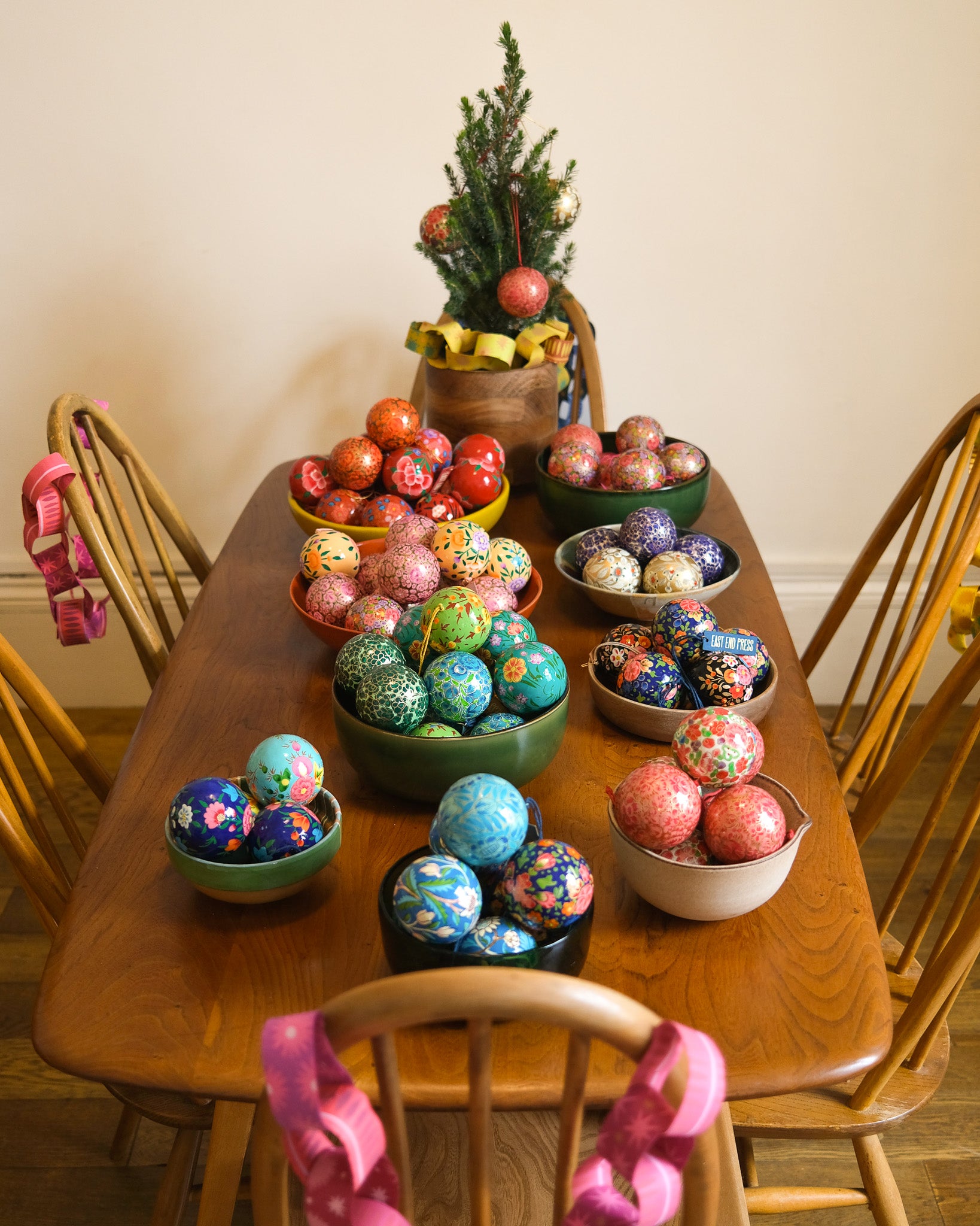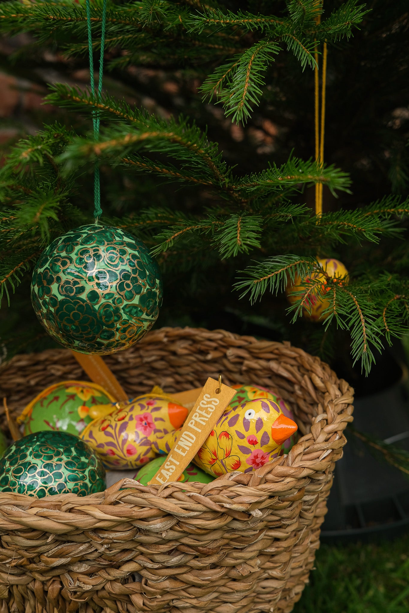 These beautiful baubles are all made from papier mâché recycled paper, hand-painted with intricate, colourful designs, and have a soft velvet hanging loop.