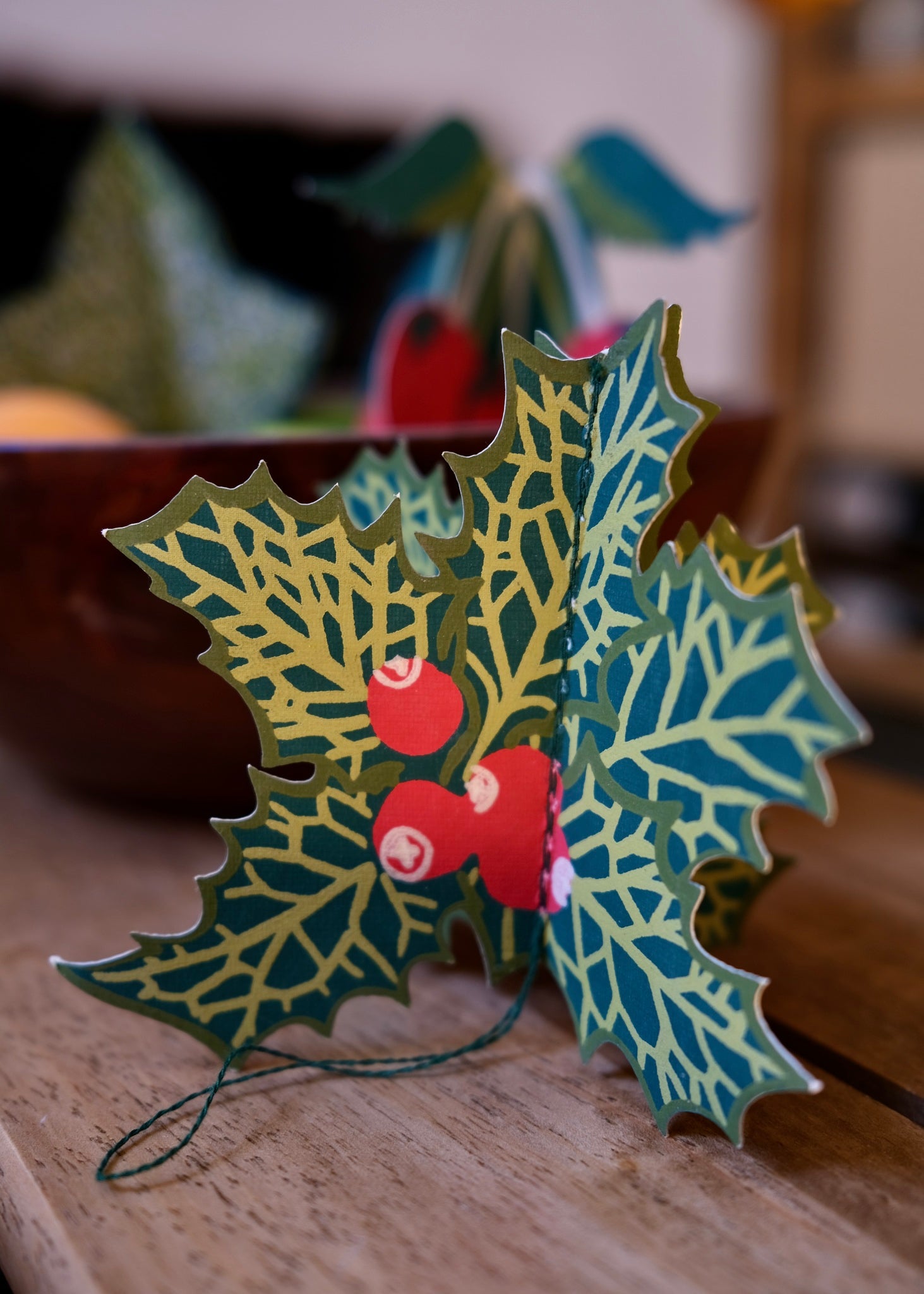 Four traditional festive plants make up this set of fold our paper decorations. Featuring ivy, holly, mistletoe and red berries.