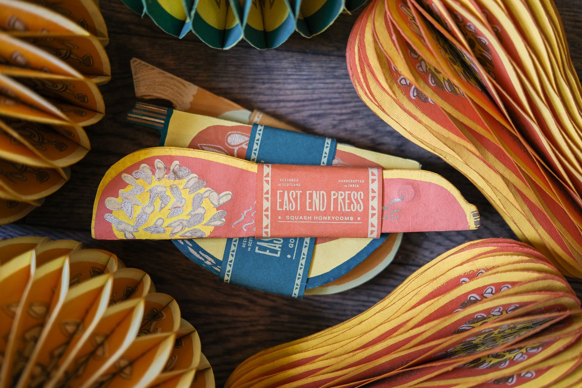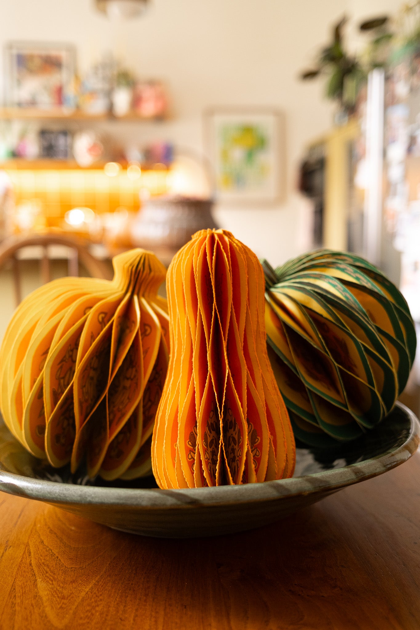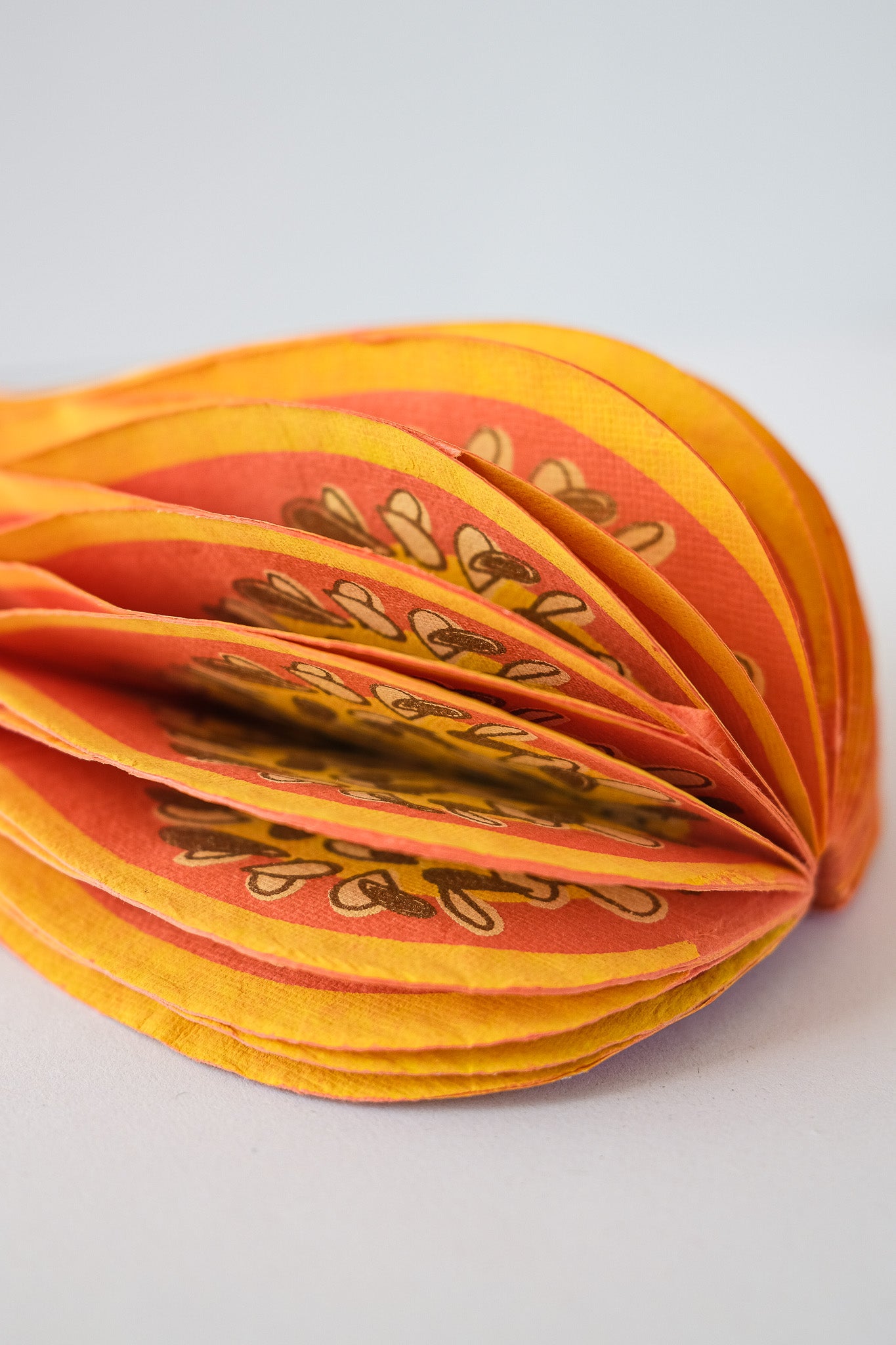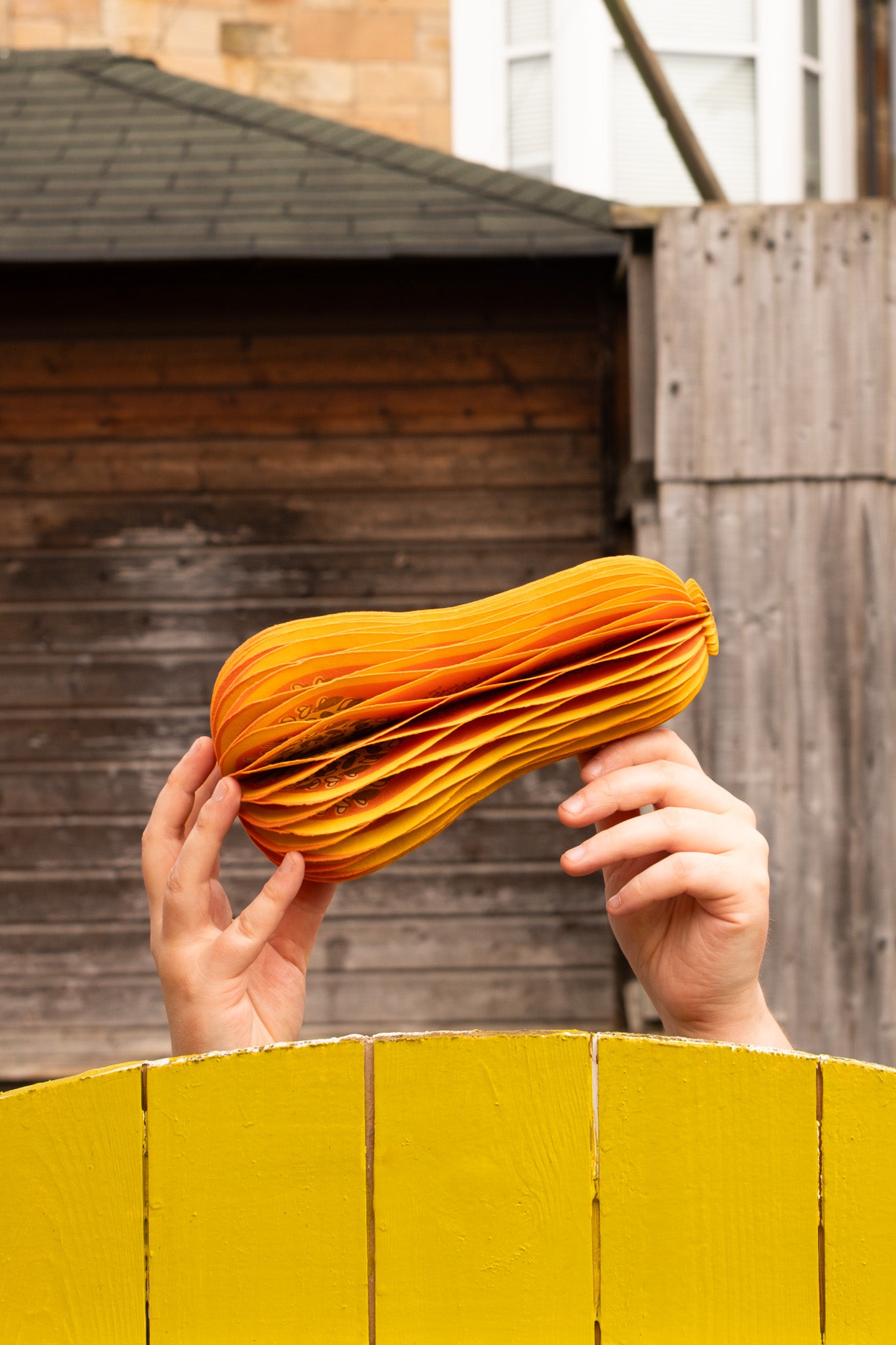 Composed of intricate layers of recycled cotton paper, each decoration unfolds to reveal a three-dimensional squash honeycomb.