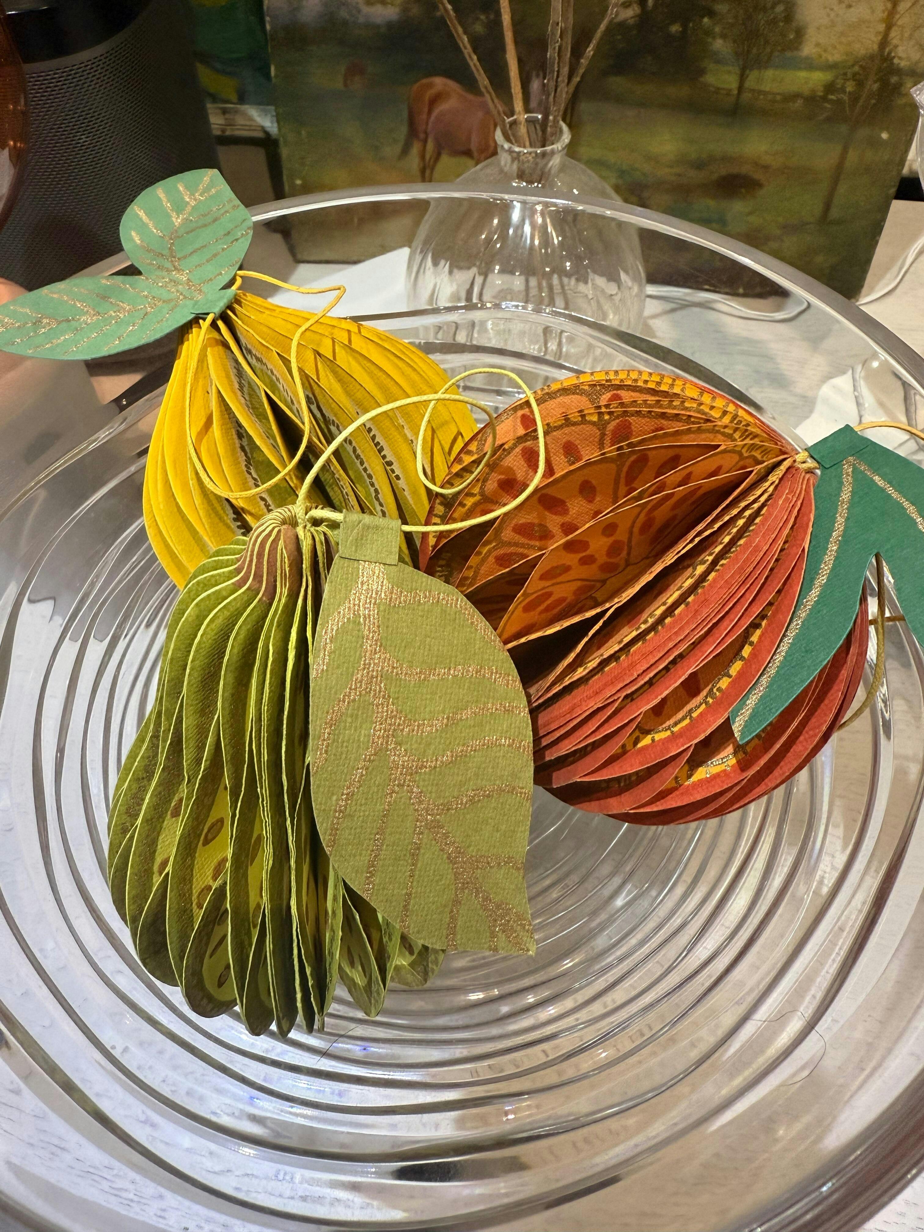 Composed of intricate layers of recycled cotton paper, each decoration unfolds to reveal a three-dimensional honeycomb pear.