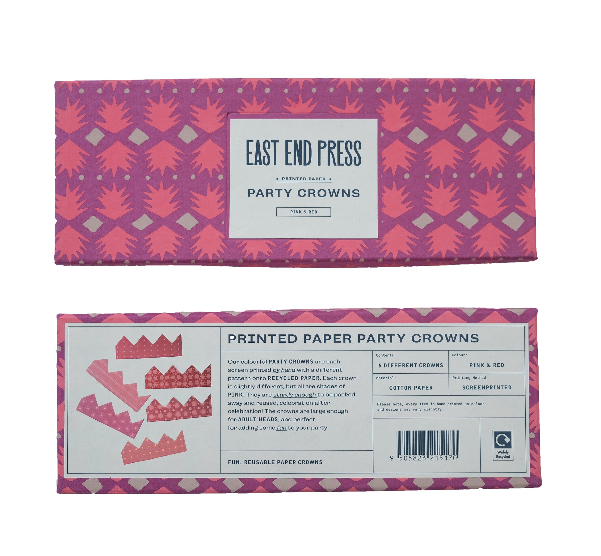 Our colourful party crowns are each screen printed by hand with a different pattern onto recycled paper. Each crown is slightly different, but all are shades of pink. They are sturdy enough to be packed away and reused celebration after celebration. The crowns are large enough for adult heads, and perfect for adding some fun to your party!