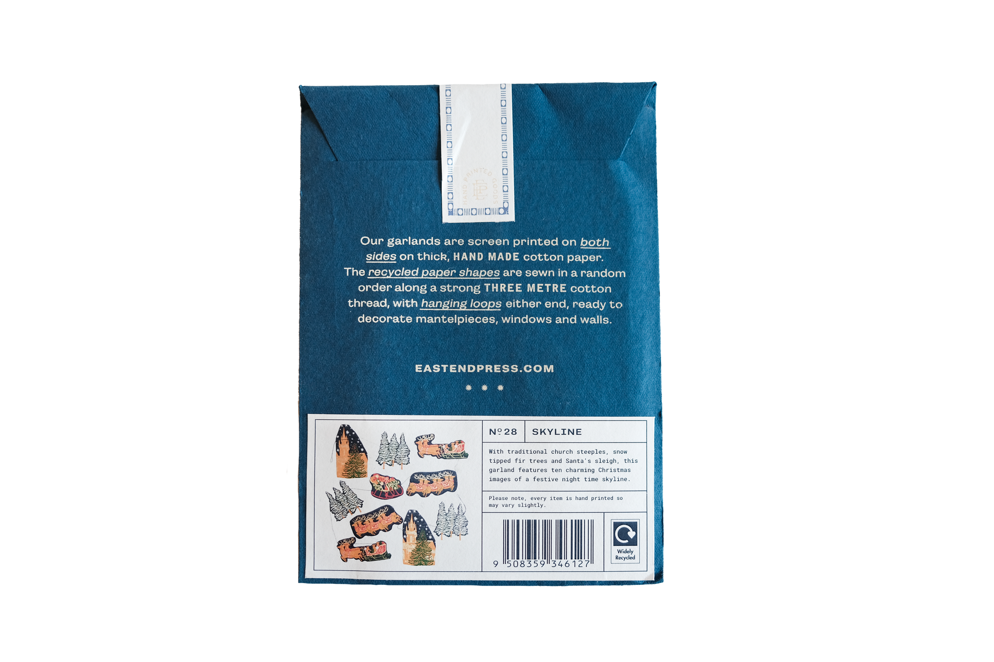 With traditional church steeples, snow tipped fir trees and Santa's sleigh, this garland features ten charming Christmas images of a festive night time skyline.